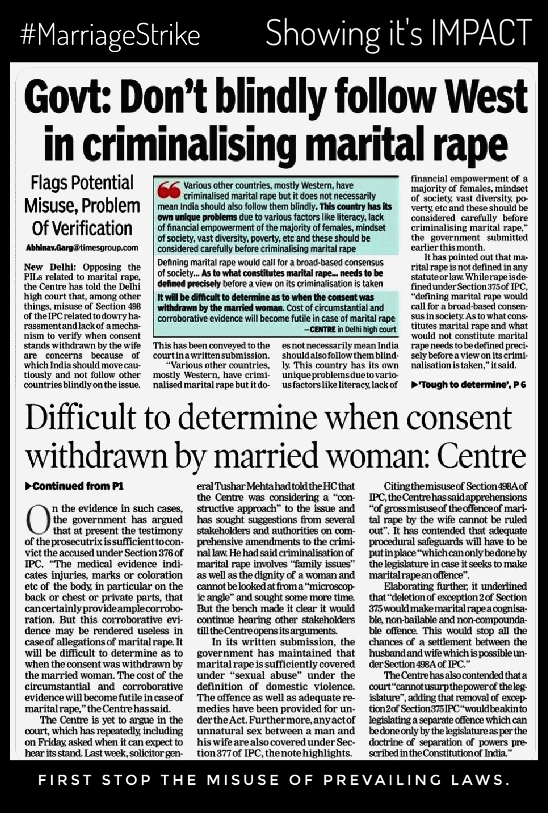 - Its the beginning of a Nationwide revolution !!! #MarriageStrike is now a reality in India.31st Jan2022, Social media is getting flooded with posts with hashtag #MarriageStrike, Indian men who were already getting oppressed by biased and women centric Laws prevailing in the Judicary system of India have taken the load of educating and opposing the attempts of feminist groups to Criminalize Maritial Rape. Why Oppose such a Law??? MustContinue reading “Its the beginning of a Nationwide revolution !!! #MarriageStrike is now a reality in India.”